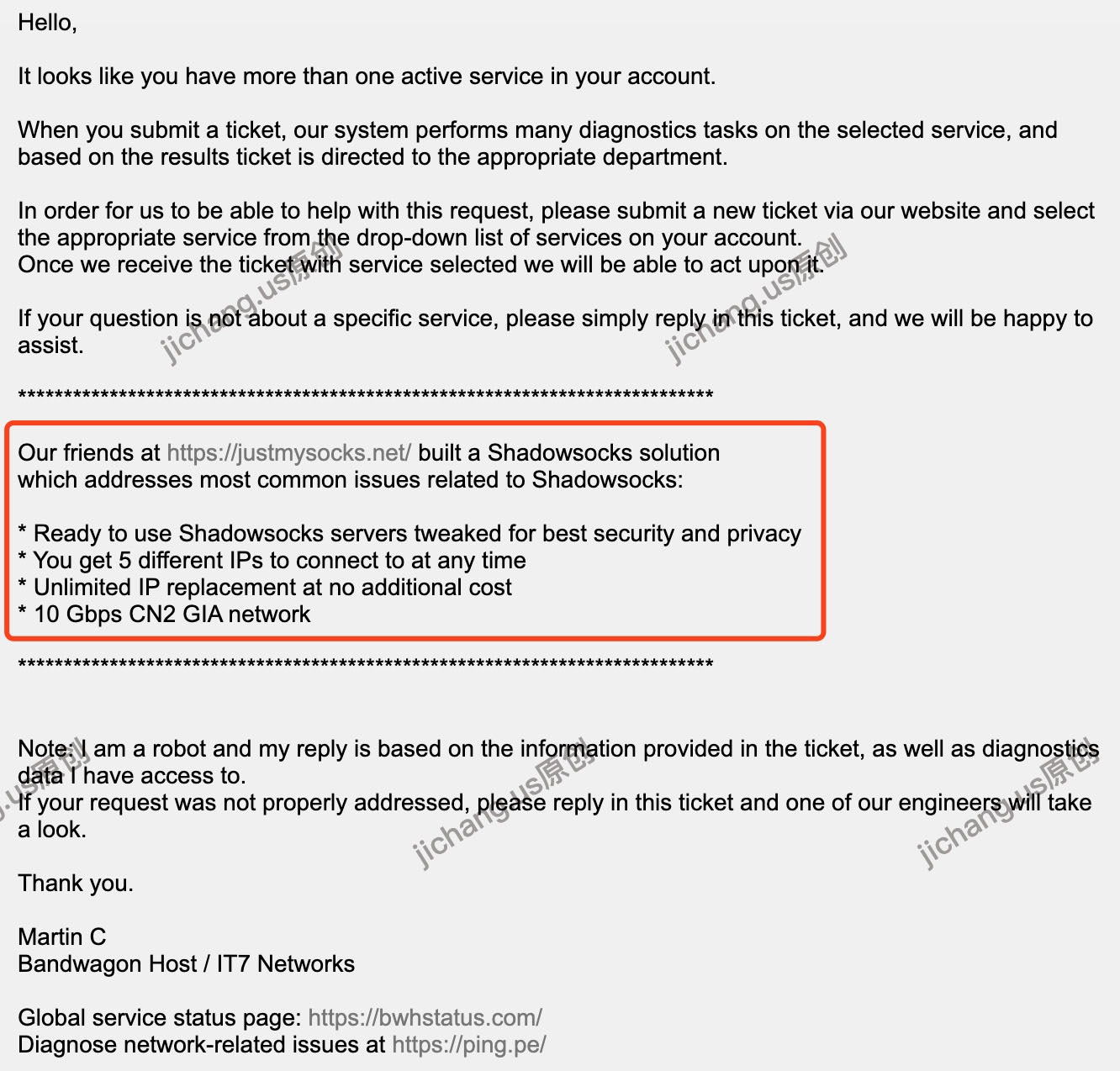 搬瓦工官方一直推荐使用Just My Socks,而不是用VPS搭建SS服务,因为VPS换一次IP是要8.79美元的