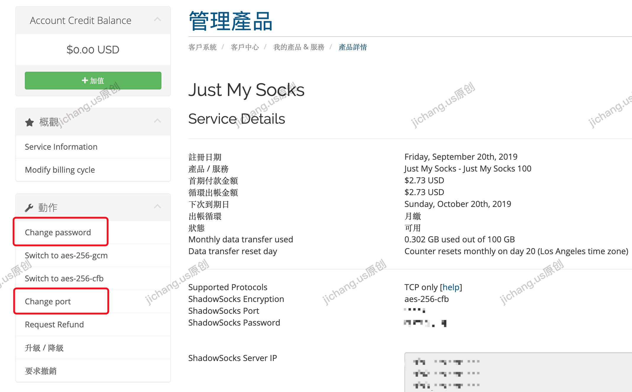 Just My Socks修改端口和密码 2019-12-09 14:41 常见问题本文由Just My Socks 中文网原创,转载请注明出处:https://www.jichang.us/posts/just-my-socks-port.html进入到控制台,Change password可以重新随机一个密码,Change port可以重新分配一个端口