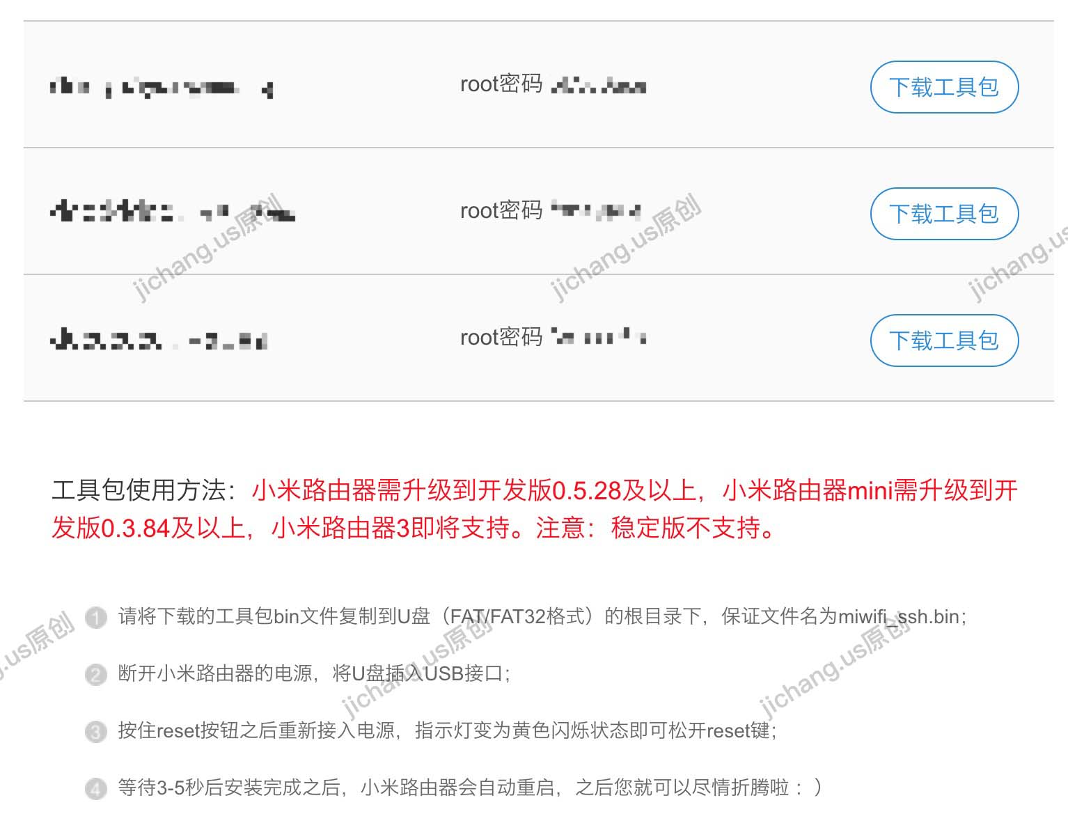 小米路由器需要先开启SSH,可以去https://d.miwifi.com/rom/ssh获取root密码,下载工具包,如图开启SSH权限